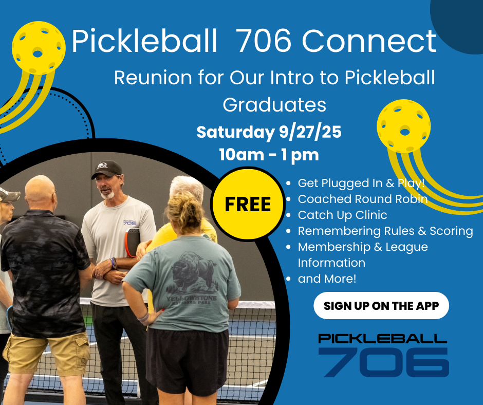 Pickleball 706 Connect Saturday, September 27, 2025 10:00 AM 1:00 PM Pickleball 706 122 WC Bryant Parkway, STE 1 Calhoun, GA, 30701 United States (map) Google Calendar ICS Fun Round Robin Social for all Intro to Pickleball Graduates and Players New to Pickleball or just beginning their journey into the sport.